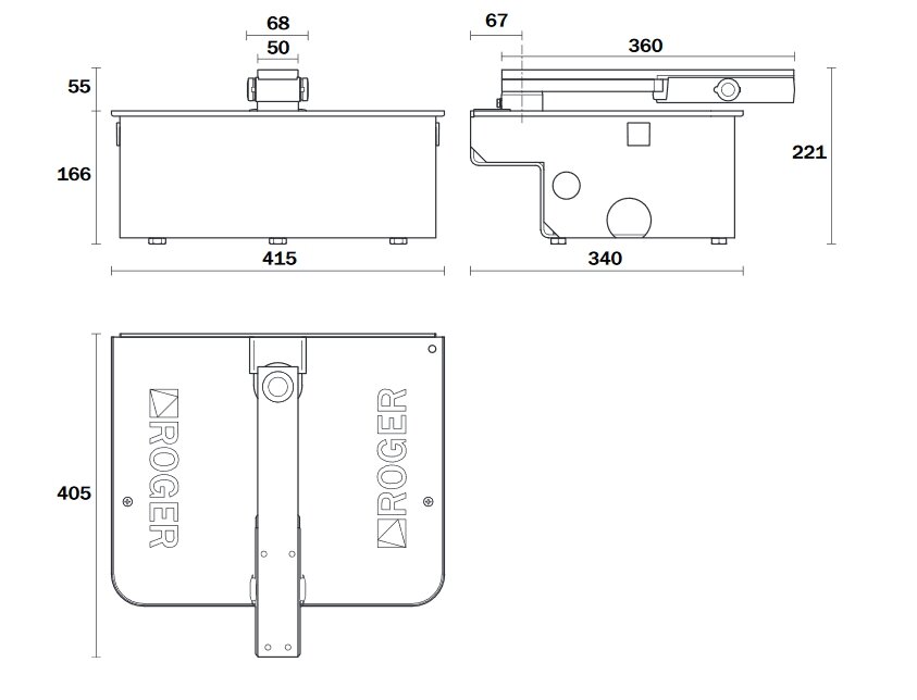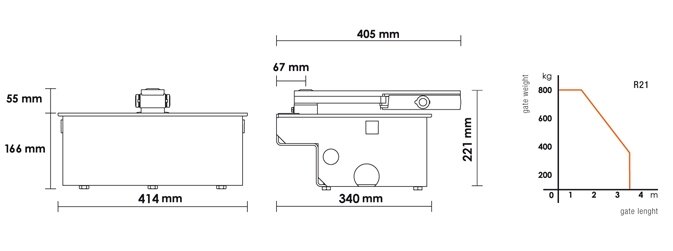 Súprava podzemných pohonov pre krídlové brány do hmotnosti jedného krídla 800kg a dĺžky krídla 3,5m. Súprava pohonu obsahuje :