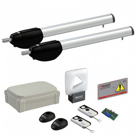 Originál sada pohonu s príslušenstvom od ROGER TECHNOLOGY!! Súprava pohonu pre super intenzívnu prevádzku. Kompletná sada pohonu pre krídlovú bránu. Určené až pre veľmi intenzívnu prevádzku. Pohony brány je možné použiť ako na otváranie dovnútra, tak na otváranie smerom von.